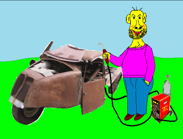 czołową kabiny. W ścianie czołowej kabiny uformowano wnęki na nogi kierowcy i pasażera. Nad nimi znajduje się blaszany panel sterowania. Przez środek ściany czołowej prowadzi blaszany tunel łączący się z tyłu z blaszaną podstawą dwumiejscowego siedziska dla kierowcy i pasażera. W tunelu mieści się tylna część silnika ze sprzęgłem i skrzynia biegów, której drążek zmiany biegów wystaje przez otwór w pokrywie tunelu do wnętrza kabiny między kierowcą a pasażerem. Nad siedziskiem, na tylnej ścianie kabiny, mocowane jest oparcie pleców kierowcy i pasażera. Nad nim w tylnej ścianie kabiny jest małe okienko. Po obu bokach kabiny umieszczone są drzwi z szybami, mocowane zawiasami do tylnych słupków. |