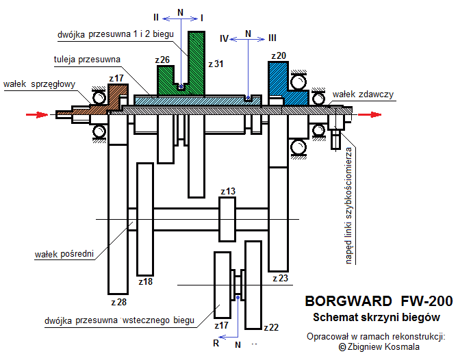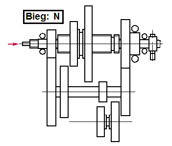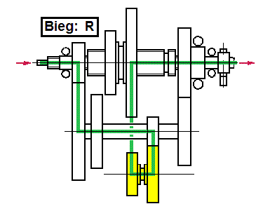 Napęd jest przenoszony z wałka sprzęgłowego przez koła zębate z17/z28, następnie z13/z22 i ostatecznie z17/z31 na wałek zdawczy z odwróceniem kierunku obrotów. W ten sposób uzyskuje się bieg wsteczny. |