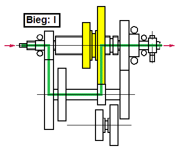 | Przesunięcie dwójki przesuwnej (z26, z31) do tyłu (na szkicu obok w prawą stronę) powoduje zazębienie koła z31 dwójki przesuwnej z kołem z13 wałka pośredniego. Dzięki temu zostanie włączony bieg pierwszy, a napęd będzie przenoszony z wałka sprzęgłowego przez koła z17/z28, a następnie z13/z31 na wałek zdawczy. |