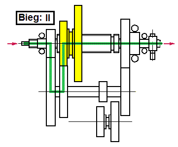 | Przesunięcie dwójki przesuwnej (z26, z31) do przodu (na szkicu obok w lewą stronę) powoduje zazębienie koła z26 dwójki przesuwnej z kołem z18 wałka pośredniego. Dzięki temu zostanie włączony bieg drugi, a napęd będzie przenoszony z wałka sprzęgłowego przez koła z17/z28, a następnie z18/z26 na wałek zdawczy. |