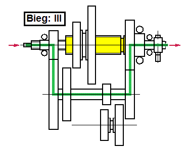 | Przesunięcie tulei przesuwnej do tyłu powoduje wsunięcie jej w wybranie wielowypustowe w kole z20, a przez to sprzęgnięcie tuleją koła z20 z wałkiem zdawczym. w ten sposób realizowany jest bieg trzeci. Napęd z wałka sprzęgłowego przenoszą na wałek zdawczy kolejno: koła z17/z28, następnie z23/z20 oraz tuleja przesuwna. |