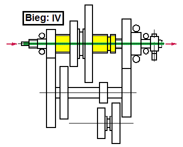 | Przesunięcie tulei przesuwnej do przodu powoduje wsunięcie jej w wybranie wielowypustowe wałka sprzęgłowego i bezpośrednie połączenie wałka sprzęgłowego z wałkiem zdawczym. W ten sposób przenoszony jest napęd z wałka sprzęgłowego, przez tuleję przesuwną, na wałek zdawczy, na bezpośrednim czwartym biegu. |