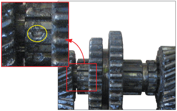 Koła zębate bez widocznych uszkodzeń zębów. Widoczne duże zużycie tulei przesuwnej na końcu współpracującym z wałkiem sprzęgłowym, gdzie powstały wgłębienia wygniecione zazębiającymi się z tuleją na biegu bezpośrednim wypustami wałka sprzęgłowego. Takie uszkodzenie tulei przesuwnej może utrudniać wyłączanie biegu bezpośredniego, a nawet powodować zakleszczanie się skrzyni na biegu bezpośrednim. Niekompletna przekładnia napędu szybkościomierza. |